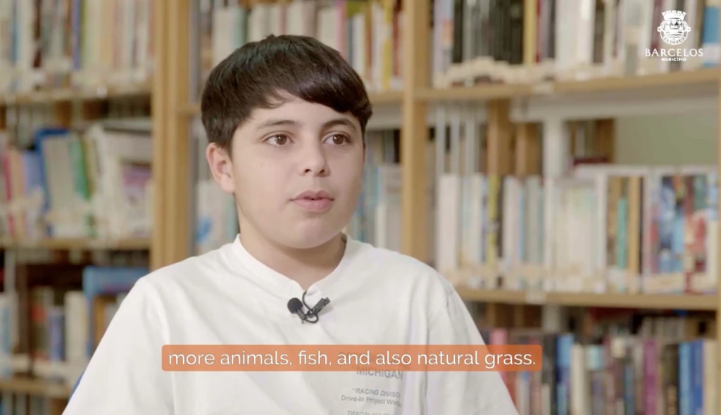 2. Nature-based learning in Barcelos. Caption: Video screenshot capturing children’s ideas for their school environment, including “more animals, fish and natural grass.” Credits: Viração & Jangada. Source: Video “Playground is Nature | Barcelos, Portugal”.