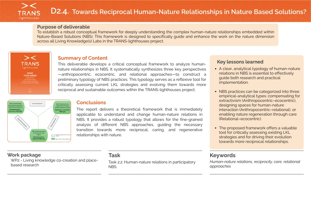 D2.4 - Deliverable report on the human-nature relationship in Nature Based Solutions (Month 16): A conceptual framework for expanding the human-nature relationship in NBS, based on a literature review with emphasis on Global South and North epistemologies, ways of its translation and incorporation into NBS, supported by collaborative work with LKLs in forms of questionnaires.