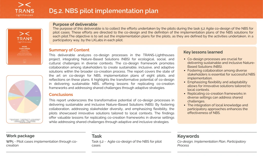 D5.2 - NBS pilot implementation plan (month 18): This deliverable reports on the implementation plan of the 8 local pilot cases (and Labs of Living Knowledge) elaborated according to the co-design process, through graphic and text material. It includes the participatory process description and the criticisms that emerged and the implementation strategy, including risk mitigation indications for each specific pilot case.