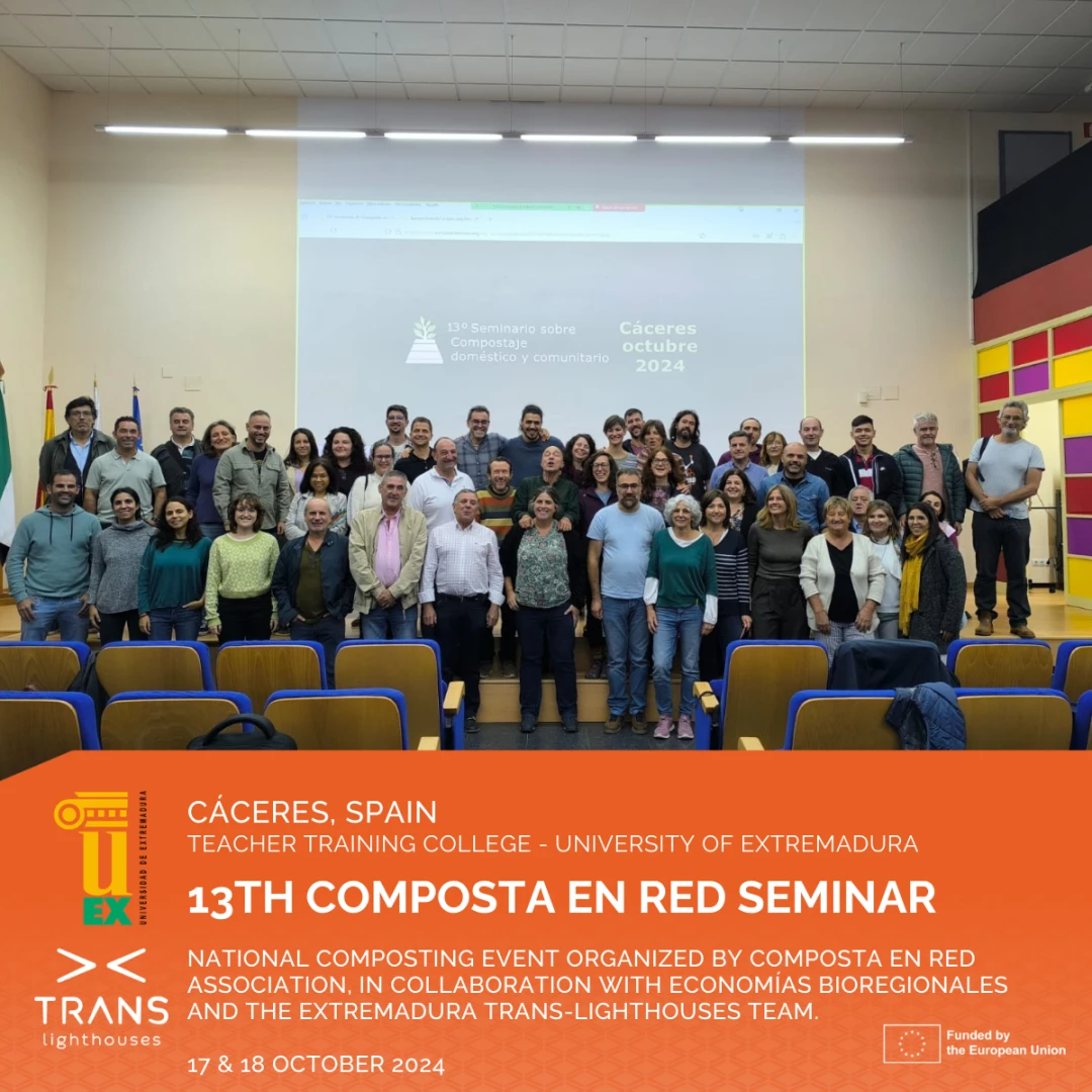 On October 17th and 18th, the University of Cáceres hosts the 13th Composta en Red Seminar, a national composting event organized by the Composta en Red association, in collaboration with Economías BioRegionales and the Extremadura TRANS-Lighthouses team. Our colleague, José Luis Fernández-Pacheco, presents the Living Knowledge Labs from our Pilot Project - a living laboratory for local composting spread throughout Extremadura, which aims to become one of the lighthouses of nature- and community-based solutions (NCBC) within the TRANS-Lighthouses project.
