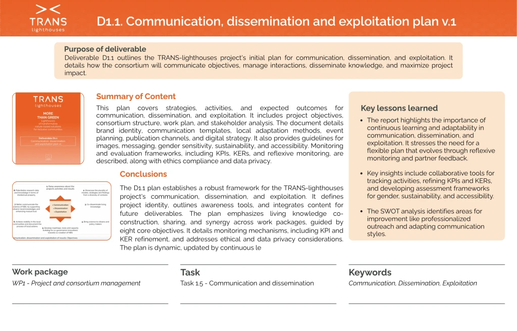 D1.1 - Communication, dissemination and exploitation plan v1 (month 06): The plan will define strategies, activities and expected results according to different target audiences, corresponding messages and tools (i.e. researchers, policymakers, local authorities, practitioners, SMEs and social enterprises, civil society organisations, citizens and local communities).