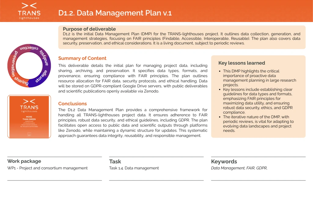 D1.2 - Data management plan v1 (month 06): The plan defines how data is collected, quality controlled, stored, protected, shared and preserved, during and after the end of the project’s implementation. This first version will be updated at months 30 and 42.